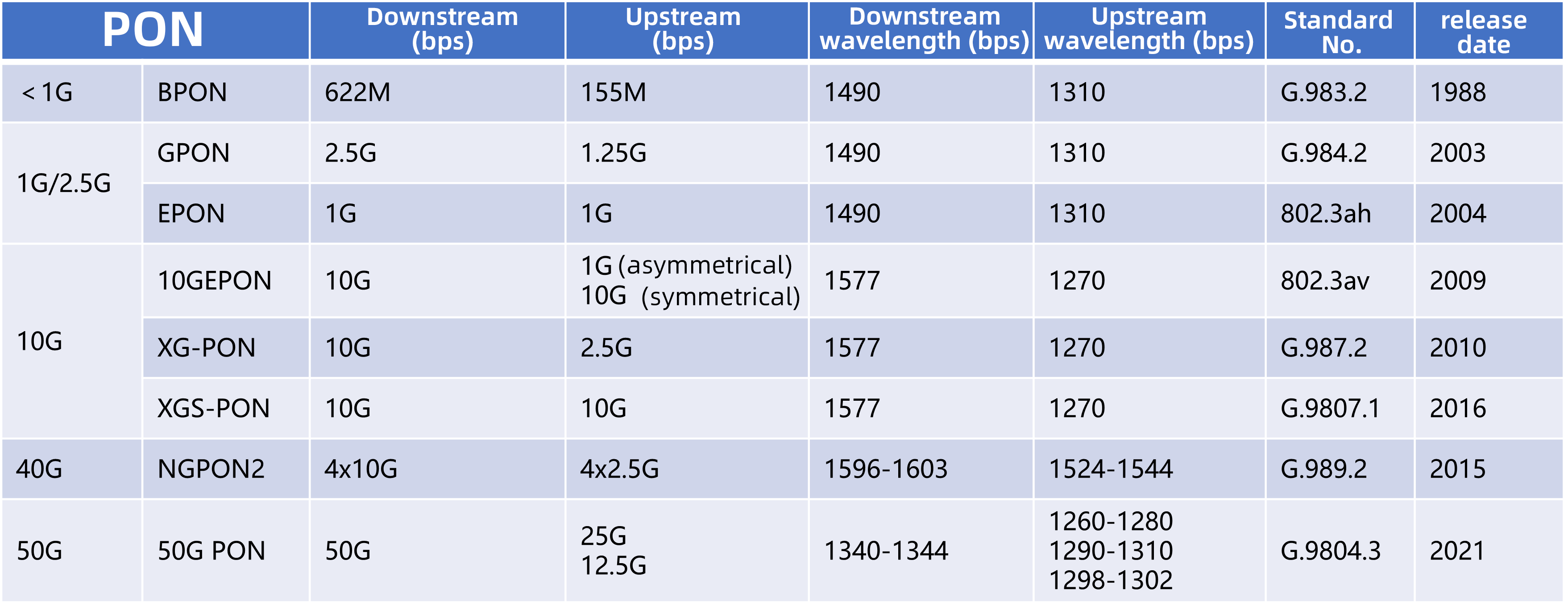 - Downstream rates up to 2.5 Gbps, upstream rates up to 1.25 Gbps.